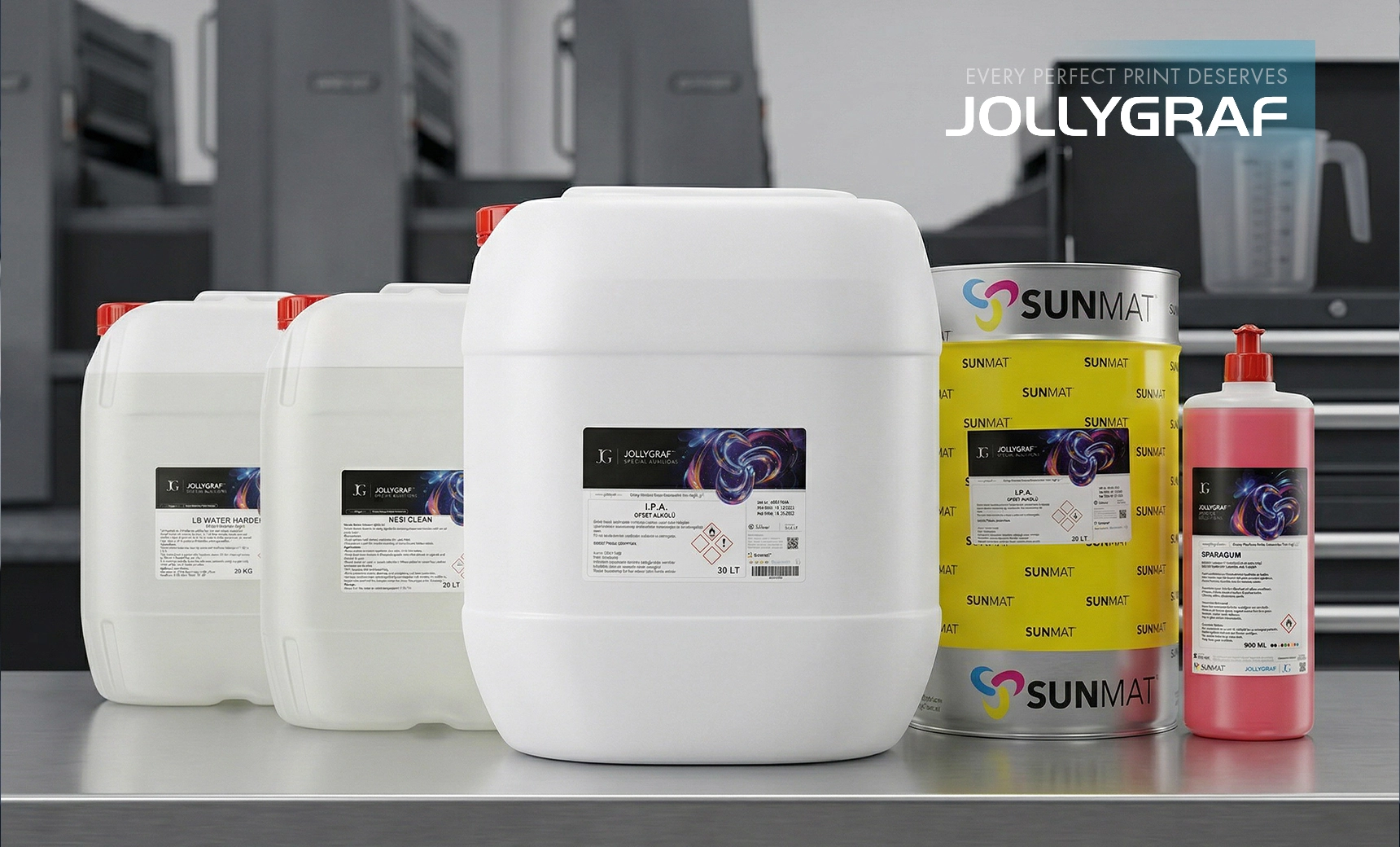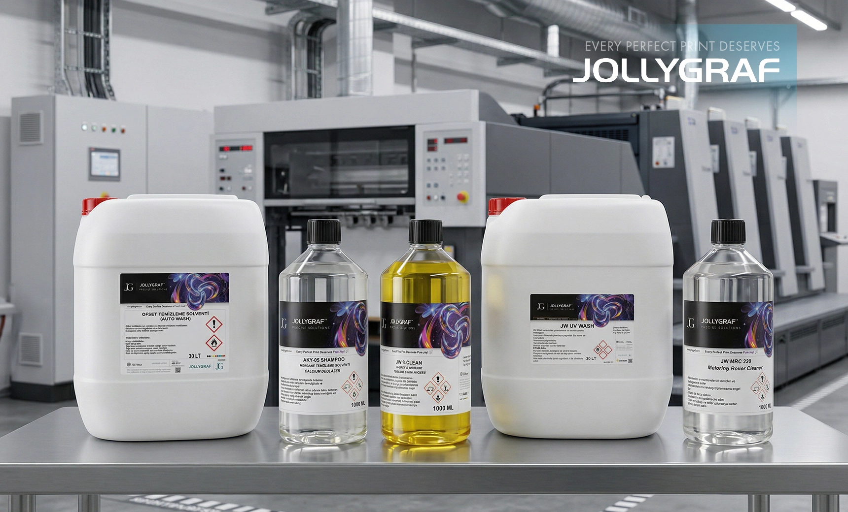 JOLLYGRAF CHEMICAL, ofset üretimde blanket/merdane temizliği, hazne suyu yönetimi ve yardımcı kimyasallarla hattın kritik noktalarını kontrol altına alır. Doğru kimya; kalıntı riskini düşürür, transferi iyileştirir ve gün boyu stabil kalite sağlar. Manuel ve otomatik yıkama süreçlerine uygun yapısıyla operatörün işini kolaylaştırır. Sonuç: daha az duruş, daha öngörülebilir performans, daha temiz çıktı.